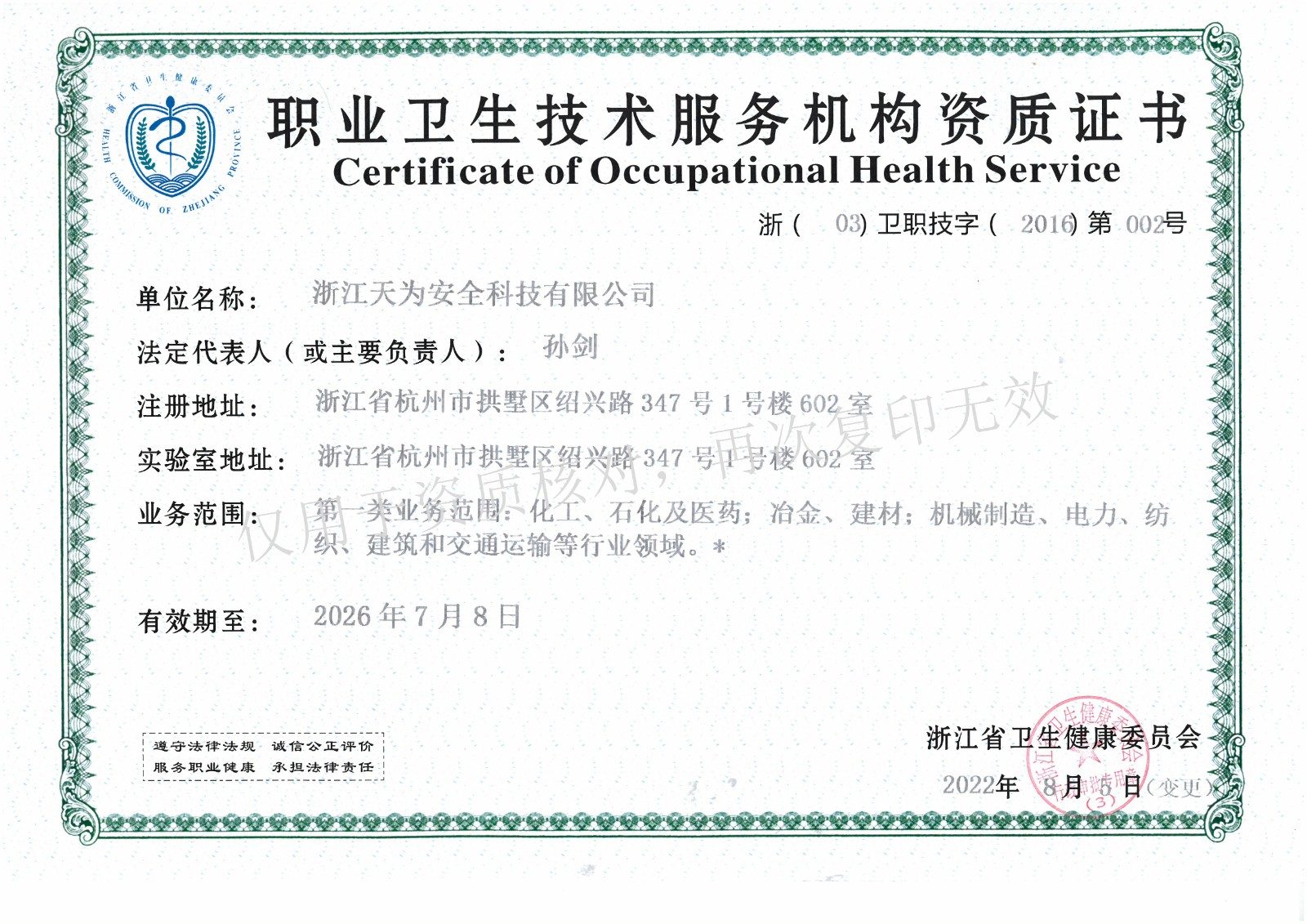 2 | 職業(yè)衛(wèi)生評(píng)價(jià) | 浙(03)衛(wèi)職技字(2016)第002號(hào) | 化工、石化及醫(yī)藥;冶金、建材;機(jī)械制造、電力、紡織、建筑和交通運(yùn)輸?shù)刃袠I(yè)領(lǐng)域; |